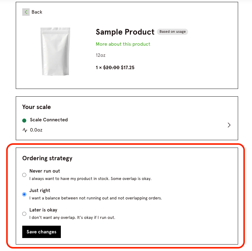 Customers can adjust how quickly their smart scale triggers future reorders using the "Ordering Strategy" setting.